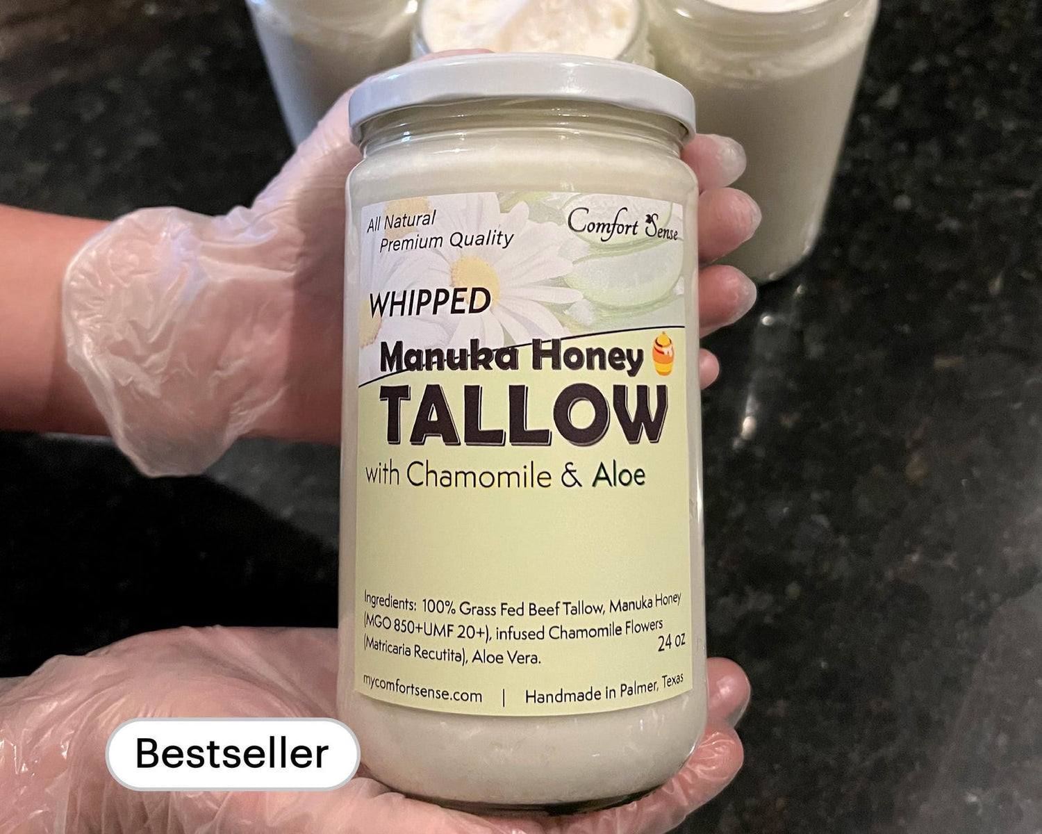Chamomile and Aloe with Manuka Honey Tallow, All-Natural Whipped Tallow with 850+MGO Manuka Honey, Unscented Whipped Tallow