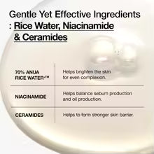 Key Active Ingredients | - 70% Rice Bran Water (brightening, hydrating) - ~2% Niacinamide (sebum regulation, brightening) - Ceramides (NP, AP, EOP) & Rice Proteins (barrier support) - Panthenol, Glycerin, Allantoin, Hyaluronic Acid (soothing, hydration) |