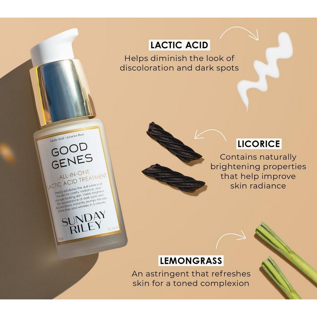 Sunday Riley Good Genes All-In-One Lactic Acid Treatment Serum deeply exfoliates the skin and instantly plumps the look of fine lines and wrinkles in 3 minutes.