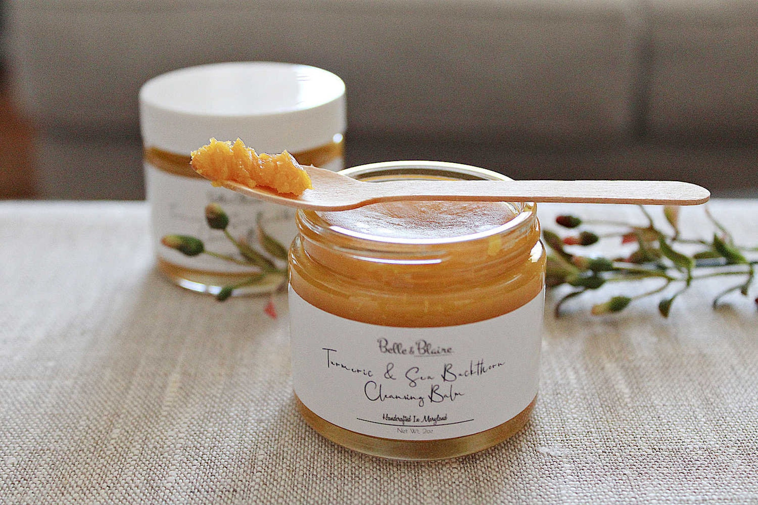 Turmeric & Sea Buckthorn Cleansing Balm is a makeup remover and cleanser that can be used as part of the double cleansing method. This cleansing balm is made with oils and butter that will emulsify into a smooth creamy lather when mixed with water. Rinse and pat dry with a clean cloth.